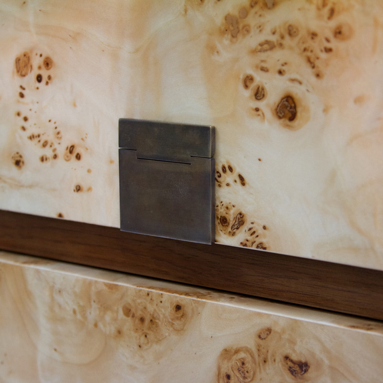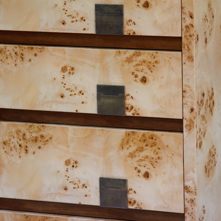 This chest of drawers features graduating height drawers veneered with slip-matched Poplar Burl, highlighted by contrasting Blackwood horizontal recesses. The aged Bronze flap handles are hand made by Anton Gerner.